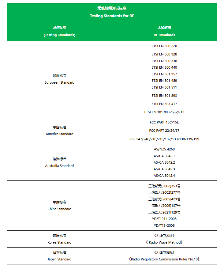 检测项目:发射功率、功率谱密度、占用时间、占空比、自适应、频道间隔、占用带宽、频率稳定度、调制带宽、发射杂散、接收杂散、带内杂散、接收阻塞及误码率、动态频率选择、敏感度、峰值功率和平均值功率比、电磁场EMF……