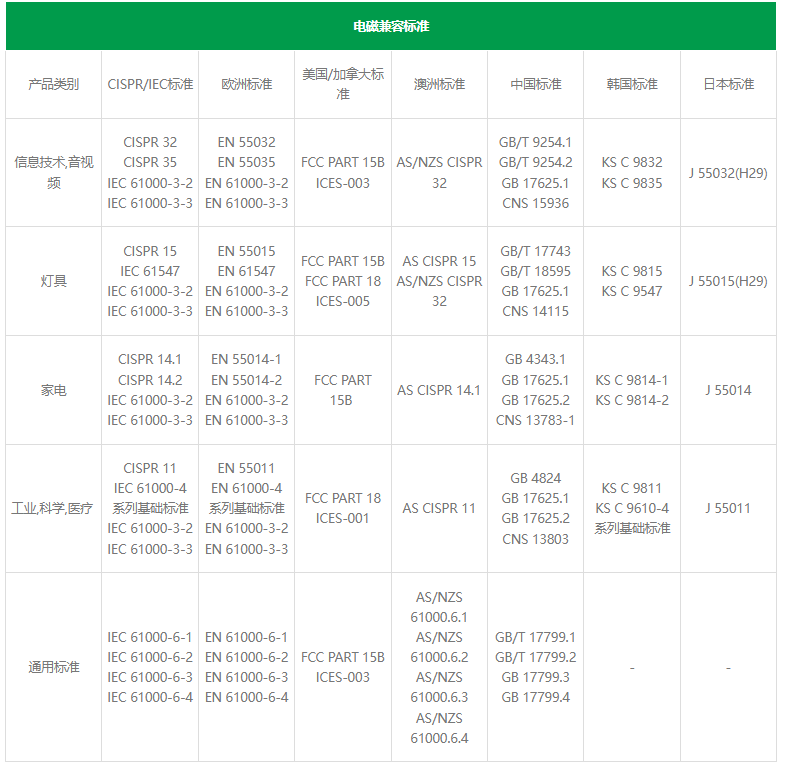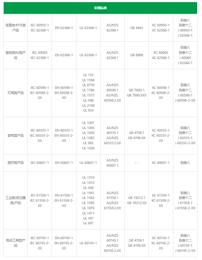 智能家居产品安规、电磁兼容标准依据终端产品的类别而定,常见终端产品测试标准如下: